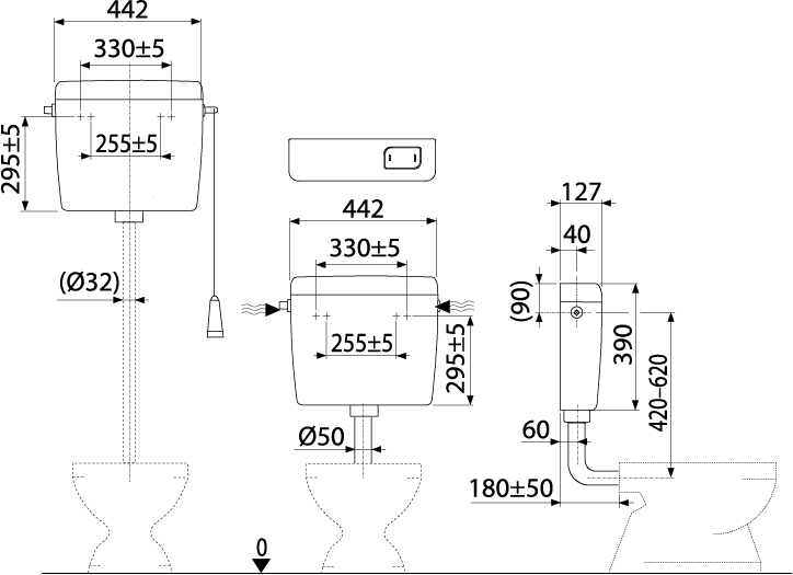 - Комплект для змиву, призначений для низькорозташованого бачка (кнопка)