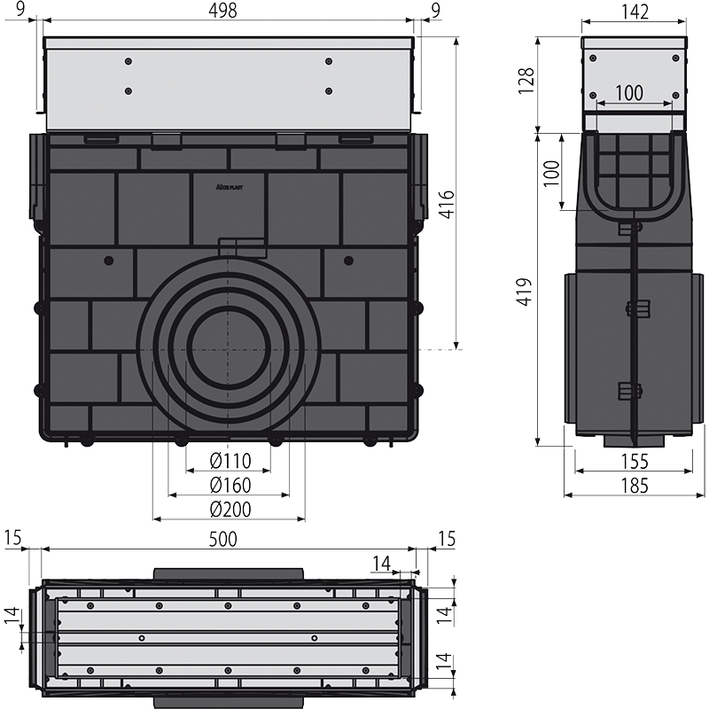 - Бокове підключення до каналізаційного стоку Ø110, 160, 200 мм